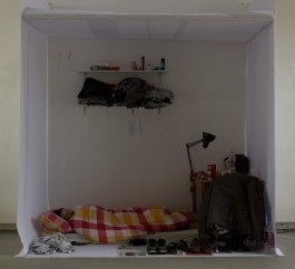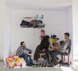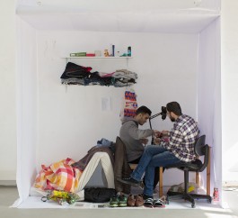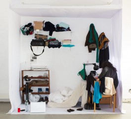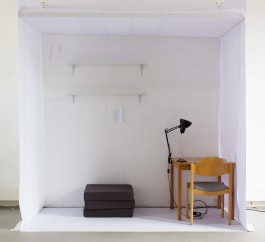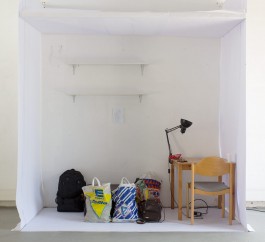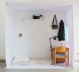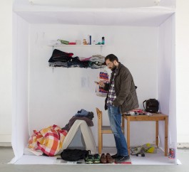 Ausgehend von einer Fläche von 3,5 qm, die Ende 2015 jedem Geflüchteten in Deutschland durchschnittlich zum Wohnen zur Verfügung stand, trennte ich während meines Aufenthaltes im Künstlerdorf Schöppingen einen Raum im Raum mit einfachsten Materialien wie Papier und Holzlatten ab. Diesen Raum möblierte ich mit notwendigen Einrichtungsgegenständen und belebte und bewohnte ihn zunächst selbst mit all den Dingen, die ich bei mir hatte (und die bereits selbst eine kleine Auswahl des Notwendigen meines gesamten Besitzes waren). Als zweites ließ ich für einige Tage meinen neuen Freund Tamim mit seinem ganzen Hab und Gut, das er in Deutschland besaß, "einziehen". Tamim war selbst aus Syrien geflohen und wartete in einer Massenunterkunft auf seine Asyanerkennung.