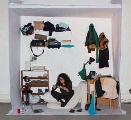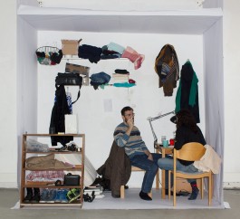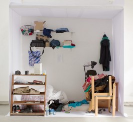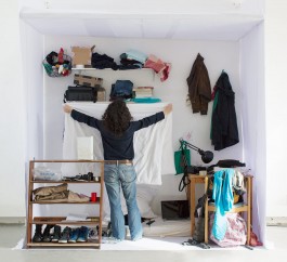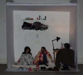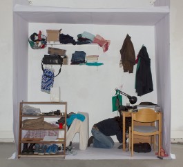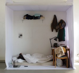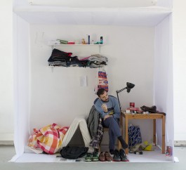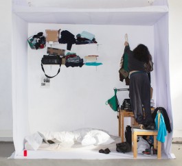 Die Arbeit ist ein performativer Ausschnitt des (Be)Wohnens und geht der Frage nach, ob jede Architektur bewohnbar ist bzw. bewohnbar gemacht werden kann, und welche Dinge man zum Leben benötigt oder sich bei Enge überhaupt leisten darf.